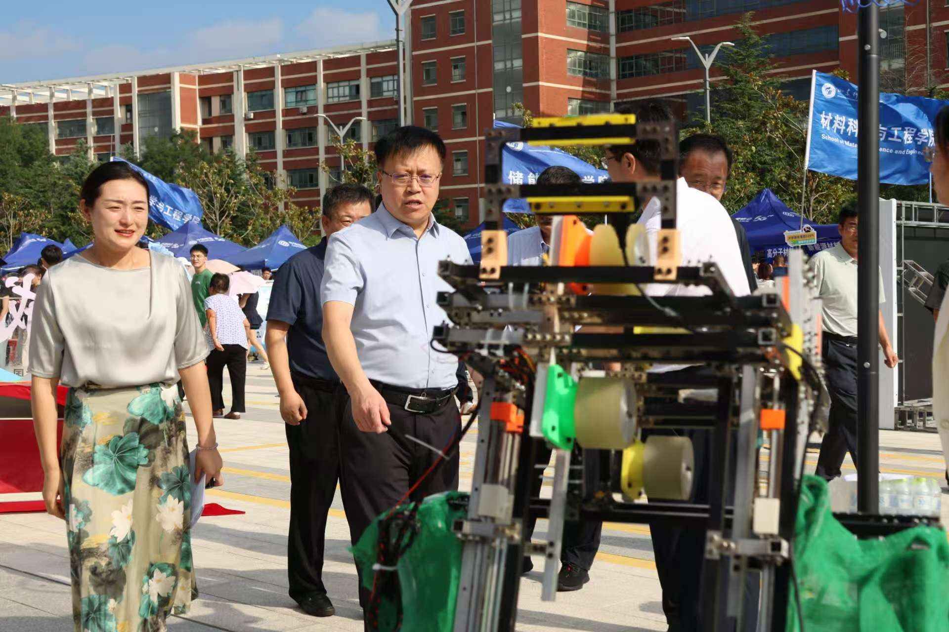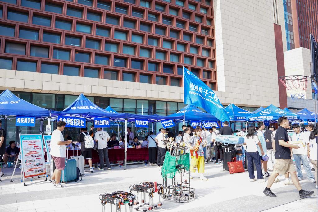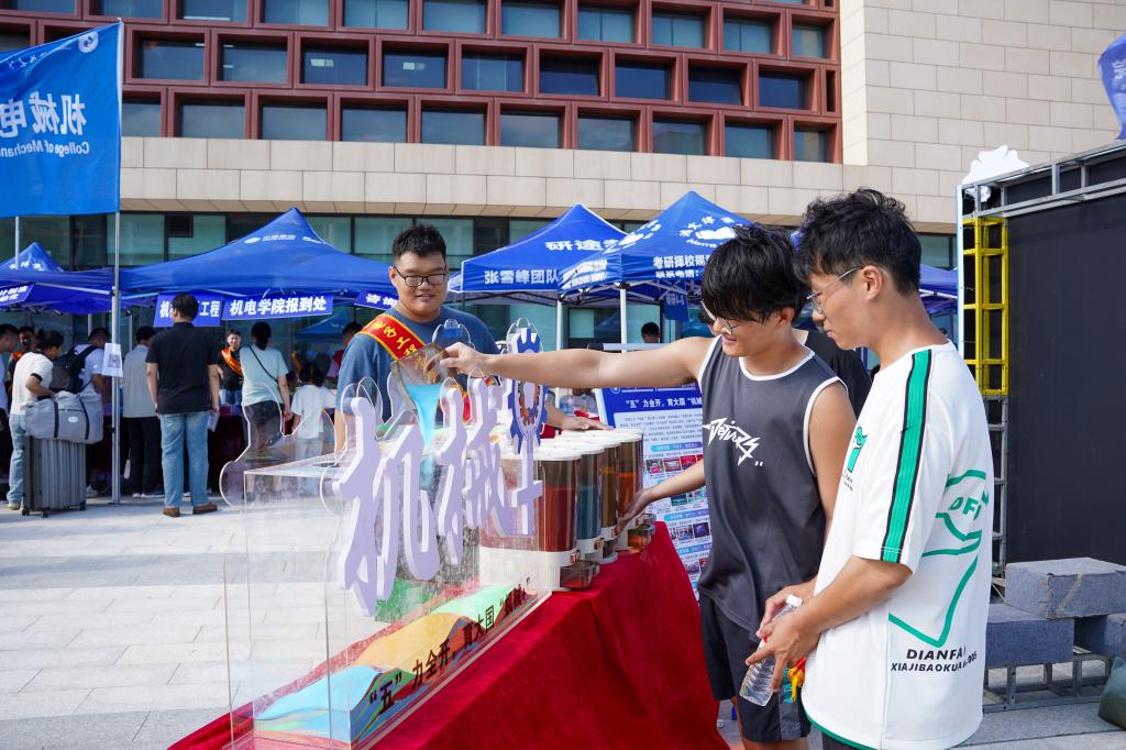 公司迎新点以“‘五’力全开,育大国‘机械+’”为主题,特别设置“五”力赋能仪式,五种颜色的彩砂分别对应“引领力、源动力、躬行力、灵动力、融合力”(学院“五维育人”核心能力),新生在志愿者引导下将彩砂倾倒入“机械+”能量仓内,寓意“五力”从此刻起融入成长血脉。此外,学院迎新点的科技展示处的机器人更是吸引了众多新生的目光,小平科技创新团队成员们为他们细心讲解,每一部投篮机器人、仿生足式机器人的背后都凝结着机电学子的心血,在新生的心中悄然种下“科创”的种子。
