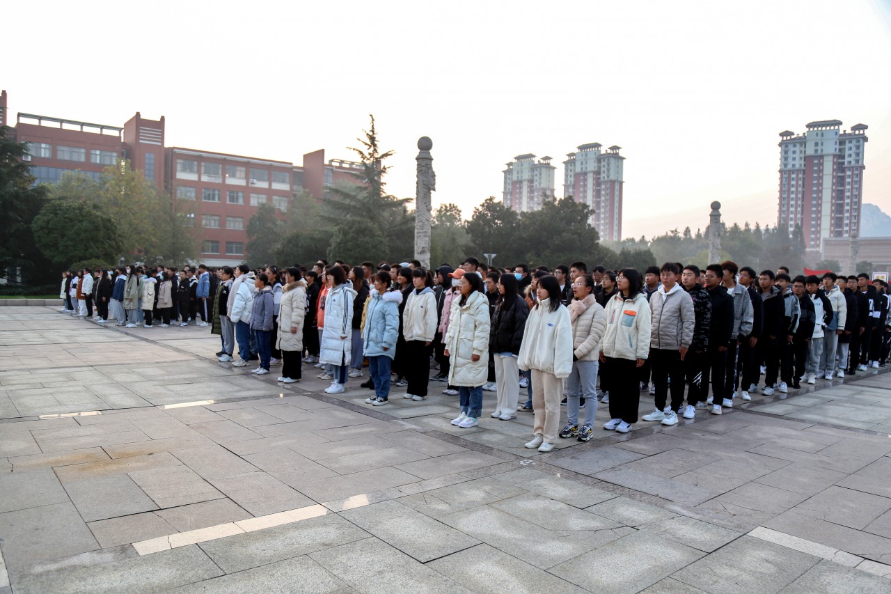 6:30,升旗仪式正式开始,国旗护卫队迈着铿锵有力的步伐将国旗护送至升旗台,伴随着庄严的《义勇军进行曲》,五星红旗缓缓升起,飘扬在泰山广场上,沐浴在曙光中,师生行注目礼,姿态笔直挺立,自豪激动之情溢于言表。