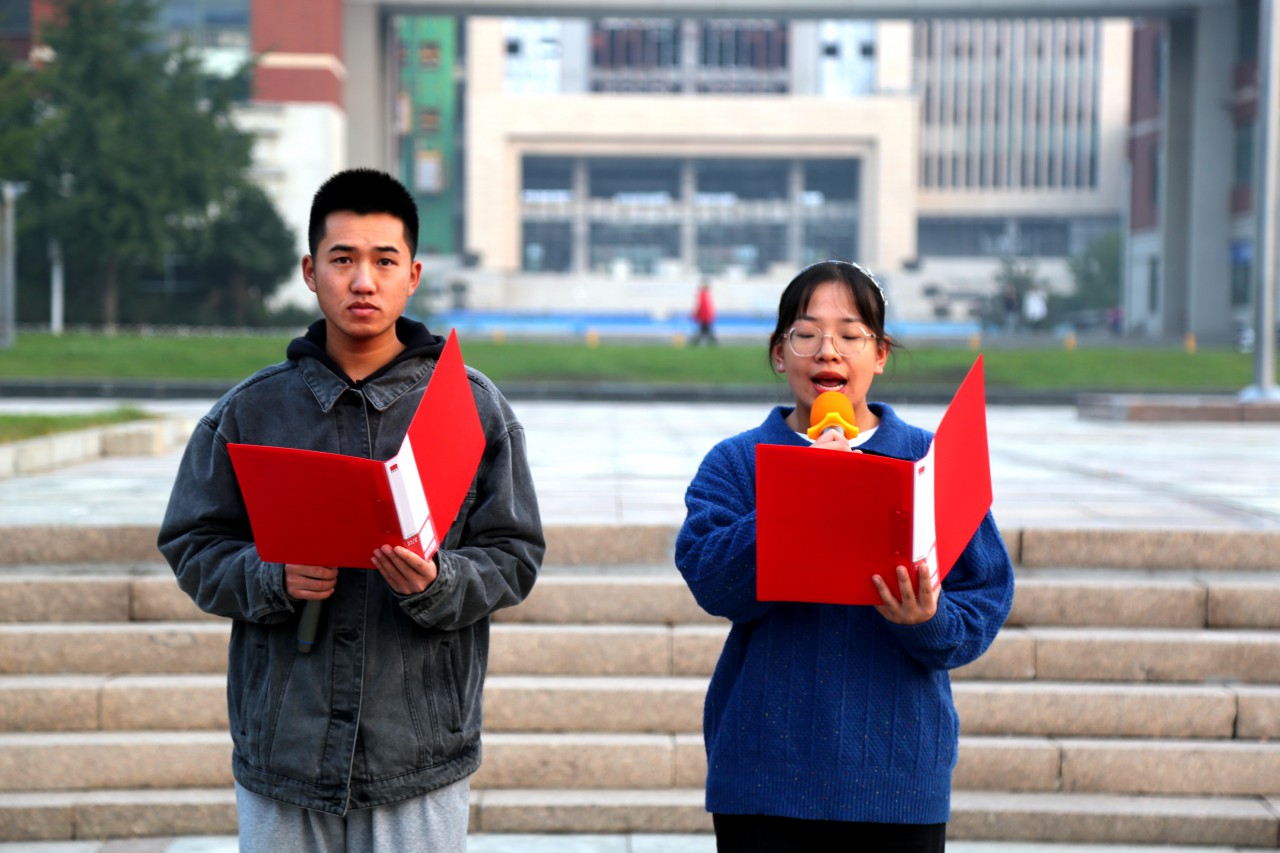 升旗仪式后,员工代表在国旗下诵读革命先烈“十一书”。十月清晨,员工代表在晨光中的诵读声情并茂,让同学们了解了赵一曼、夏明翰、陈毅安等革命先烈的英雄故事,领略到了他们用生命书写忠诚、用鲜血捍卫信仰、用热血滋养中国的无我精神。深秋天寒,但每个人内心都热血沸腾。在场的师生仿佛身临其境,感受到了当年先烈们的无畏与伟大,并向他们致以最崇高的敬意。
